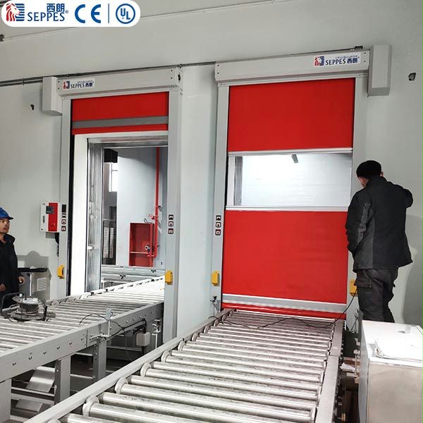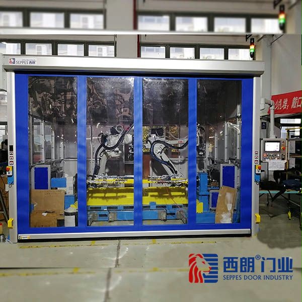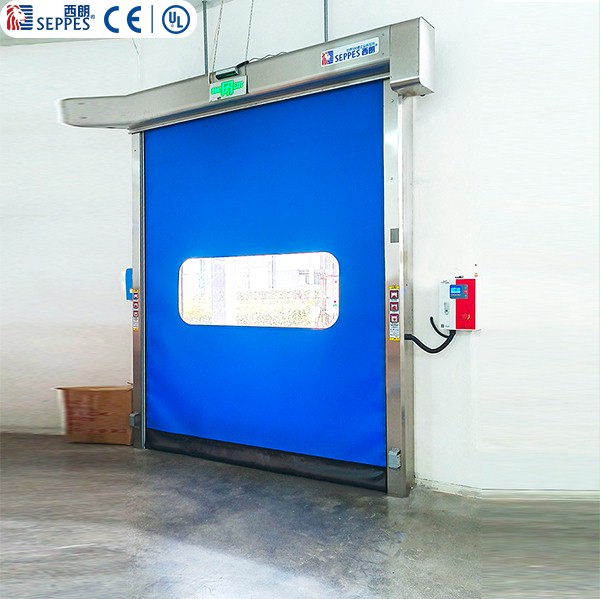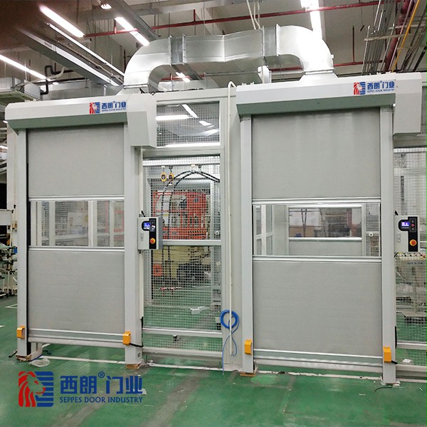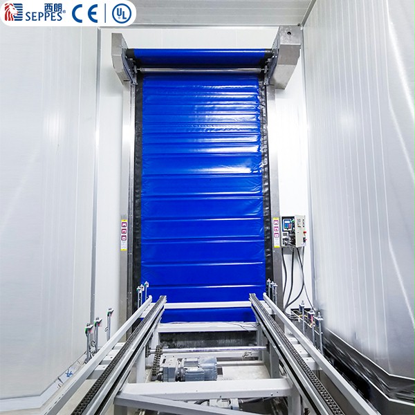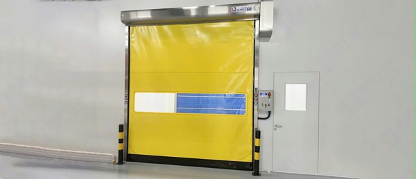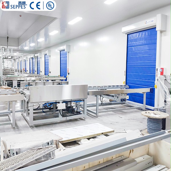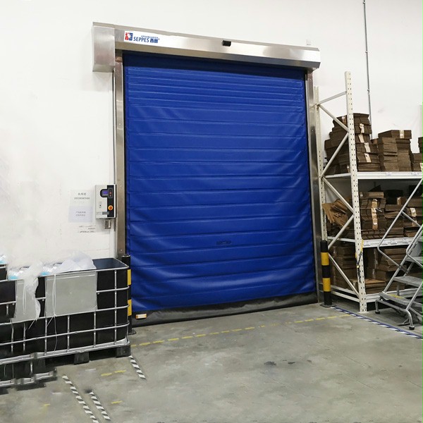 食品工廠刷洗間設計的快速卷簾門,采用拉鏈結構密封+PVC高韌門簾+304不...